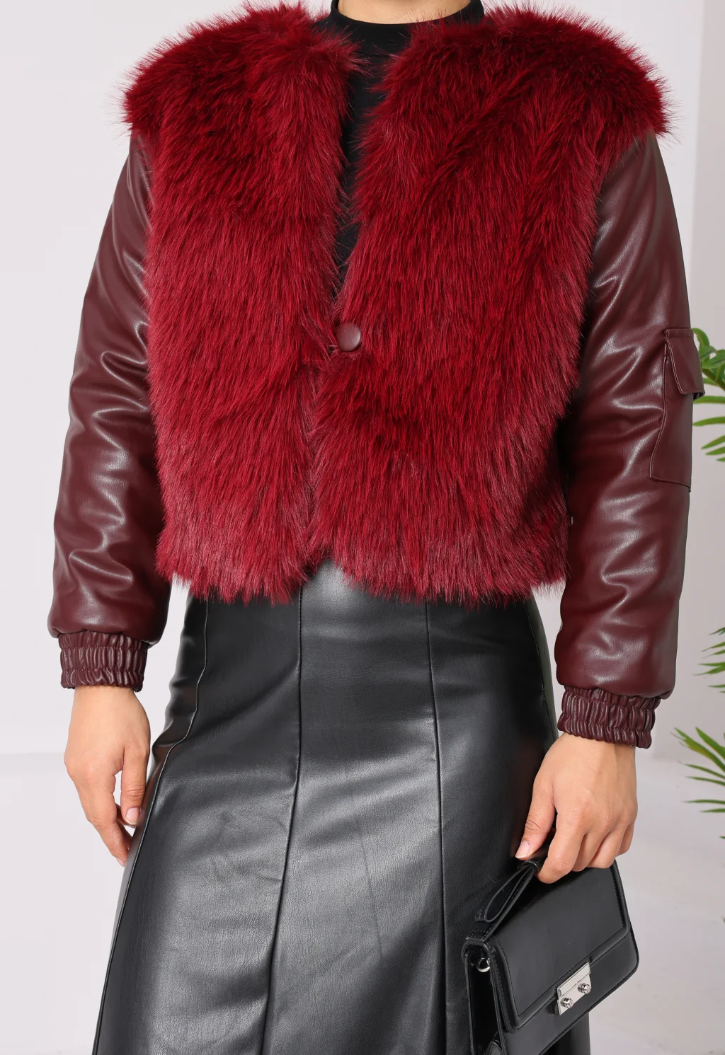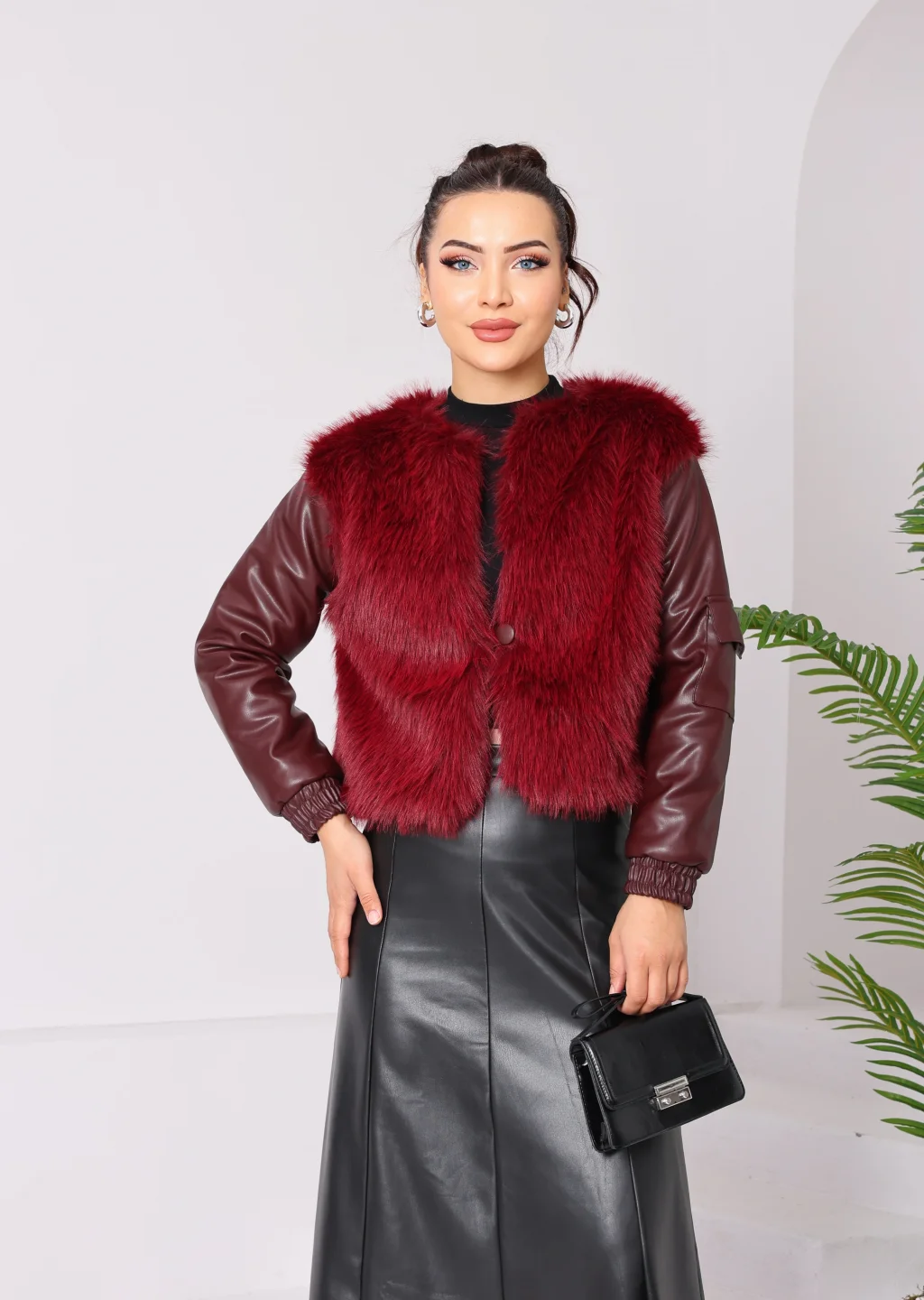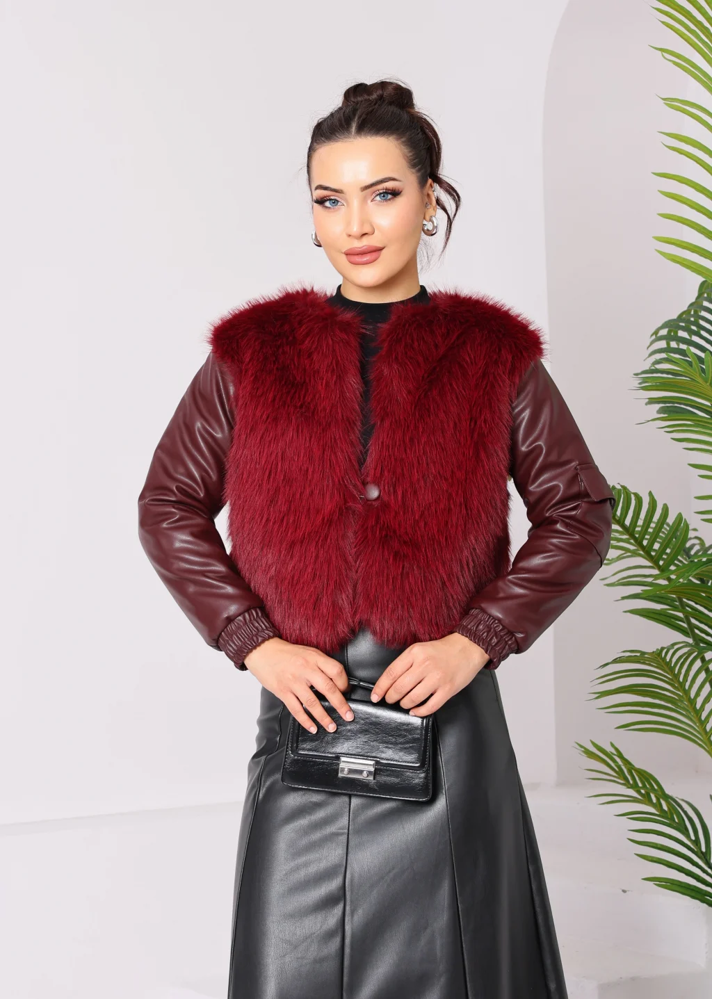 Kolu Cep Detaylı Deri&kürk Ceket Bordo