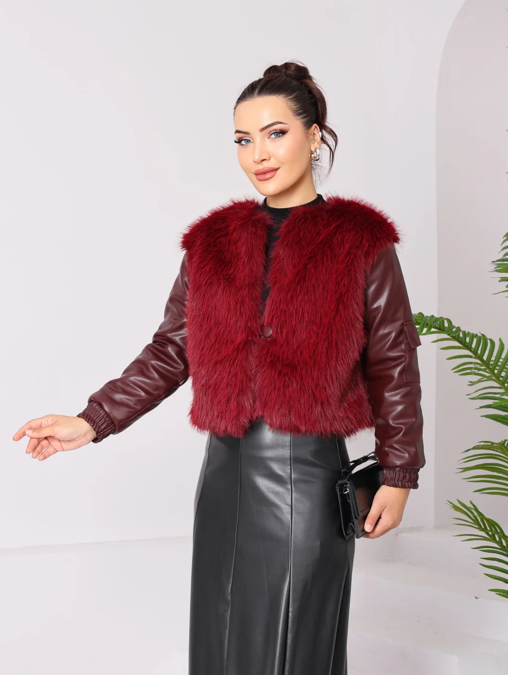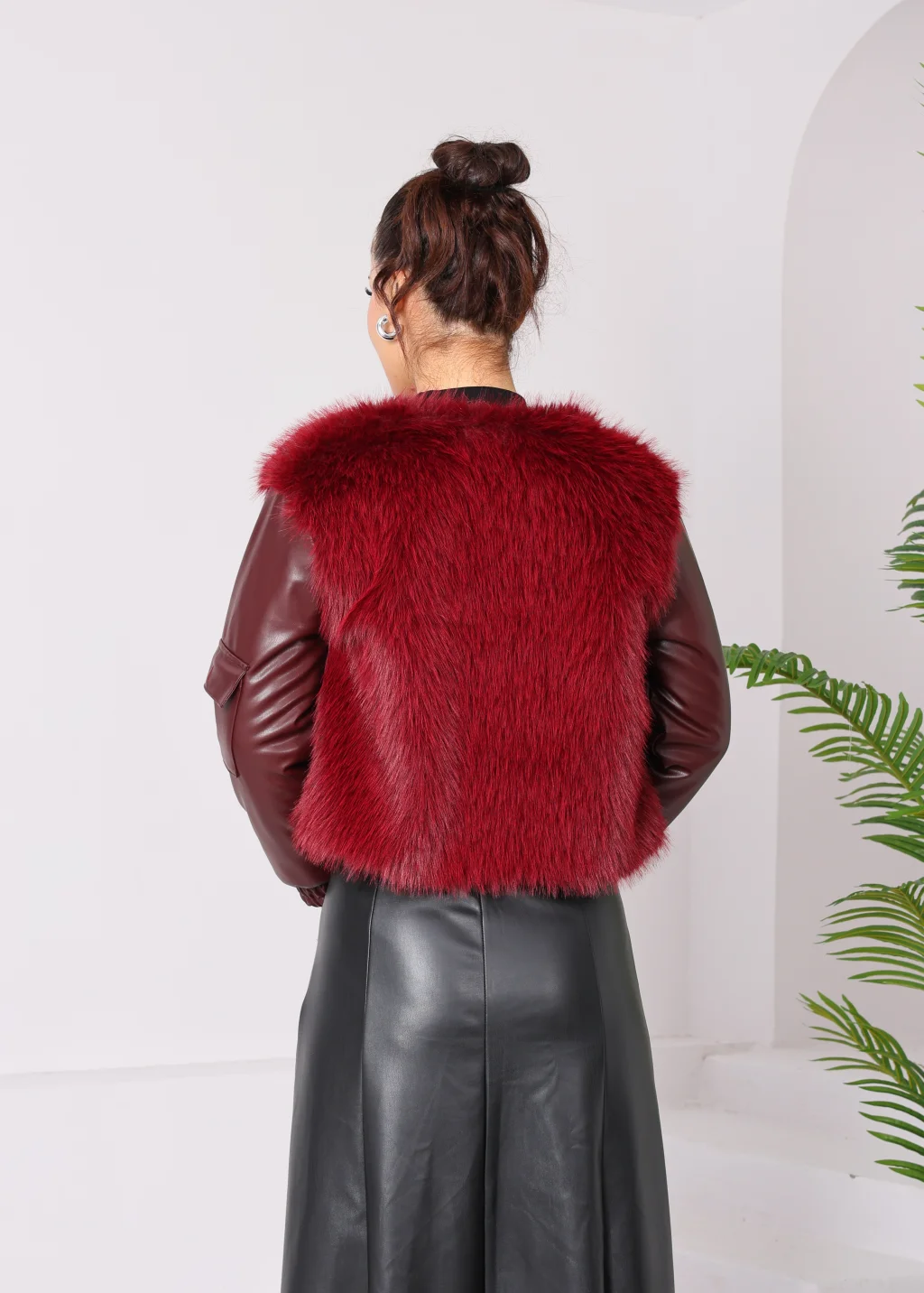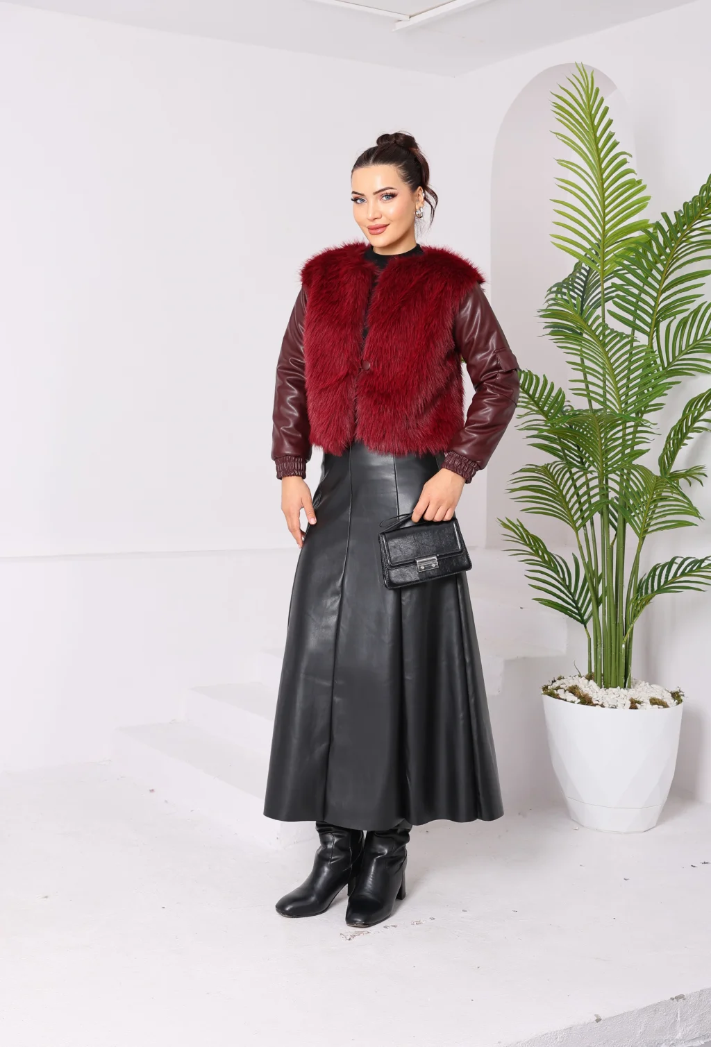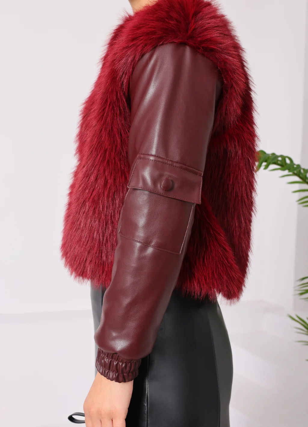 Kolu Cep Detaylı Deri&kürk Ceket Bordo