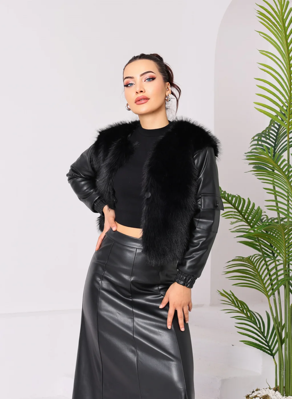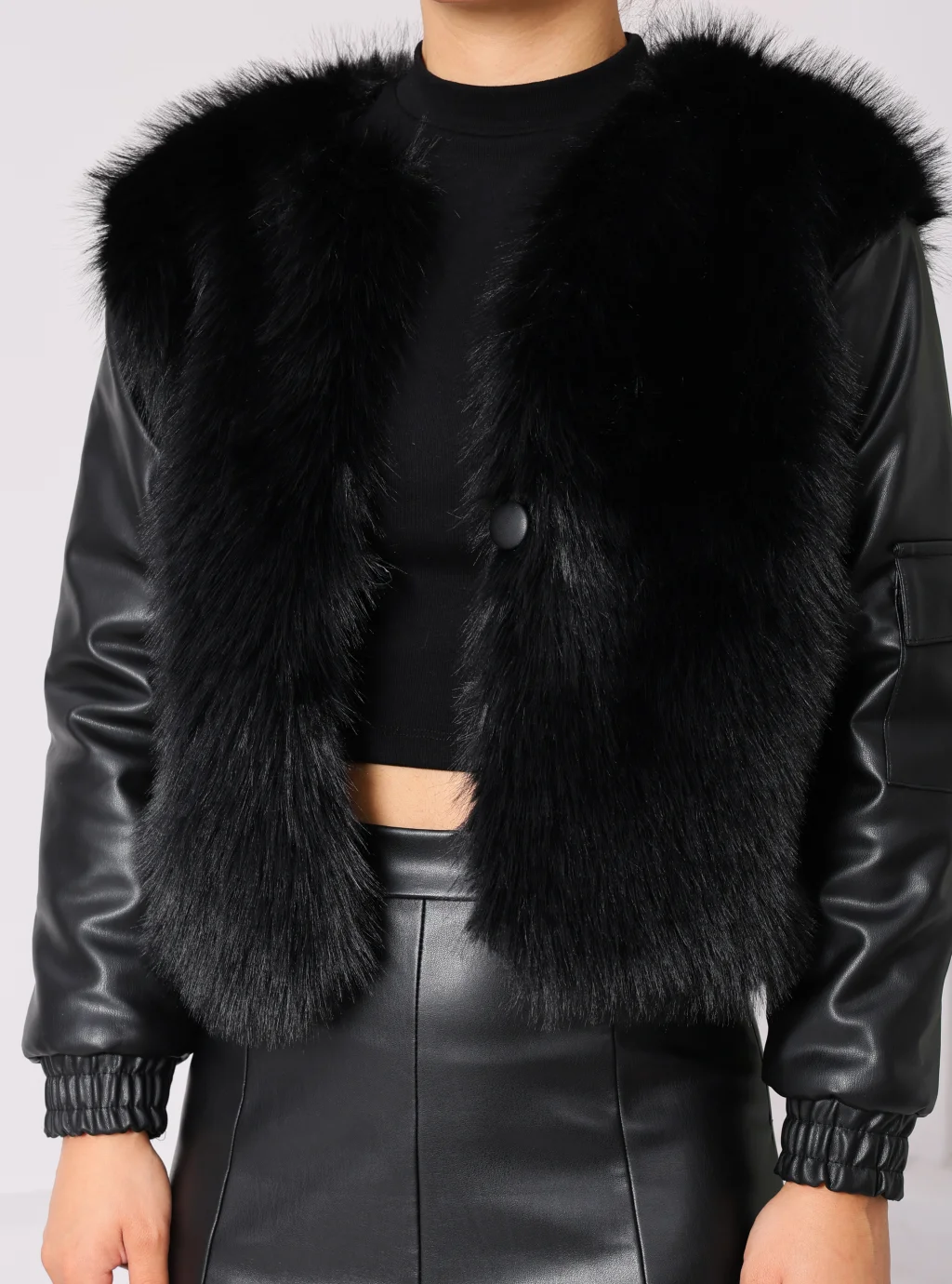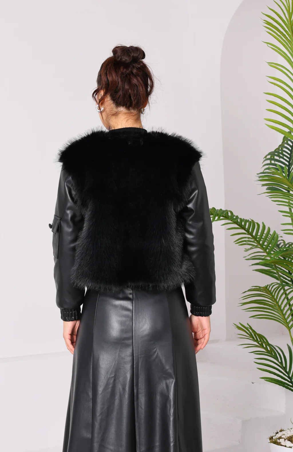 Kolu Cep Detaylı Deri&Kürk Ceket Siyah
