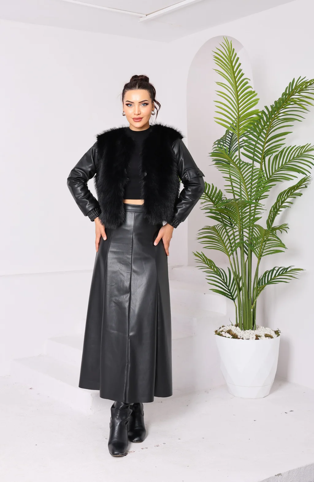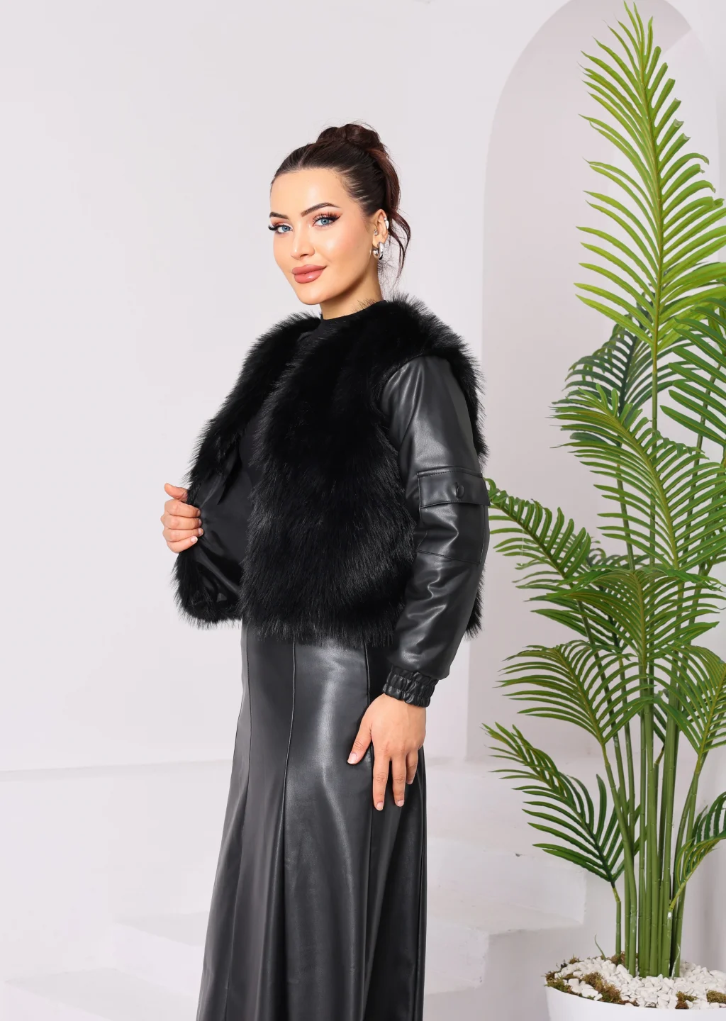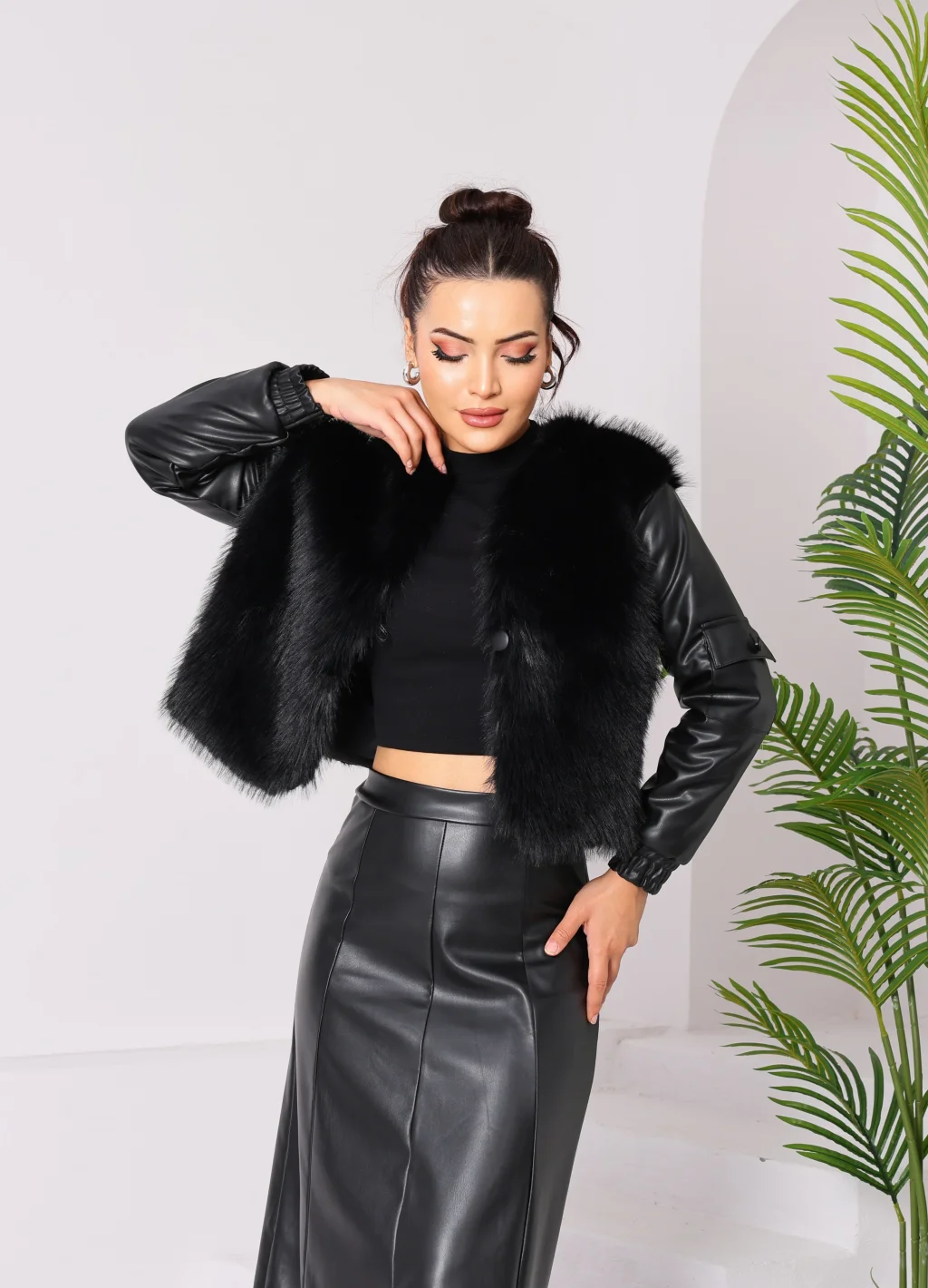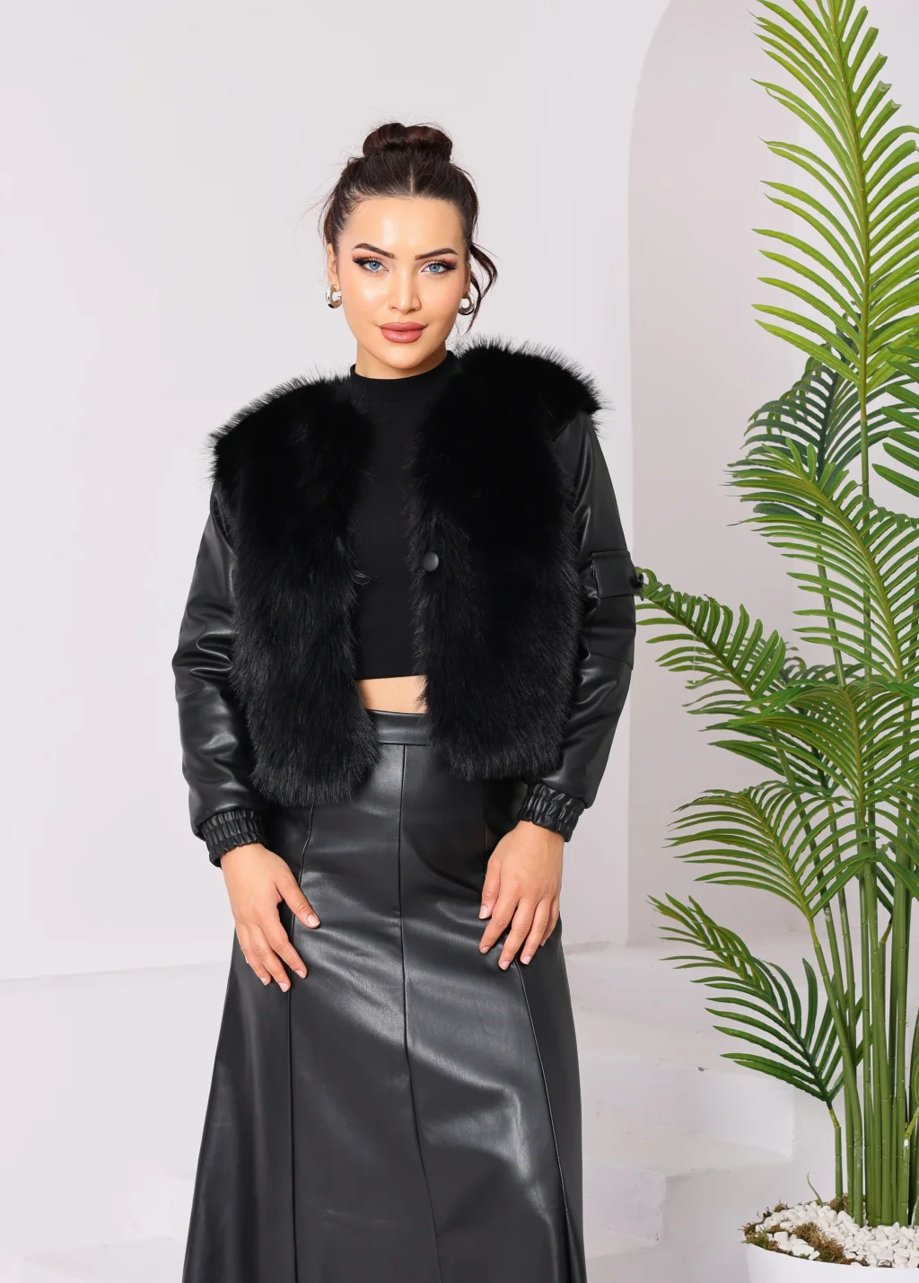 Kolu Cep Detaylı Deri&Kürk Ceket Siyah