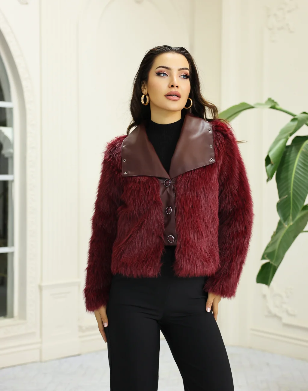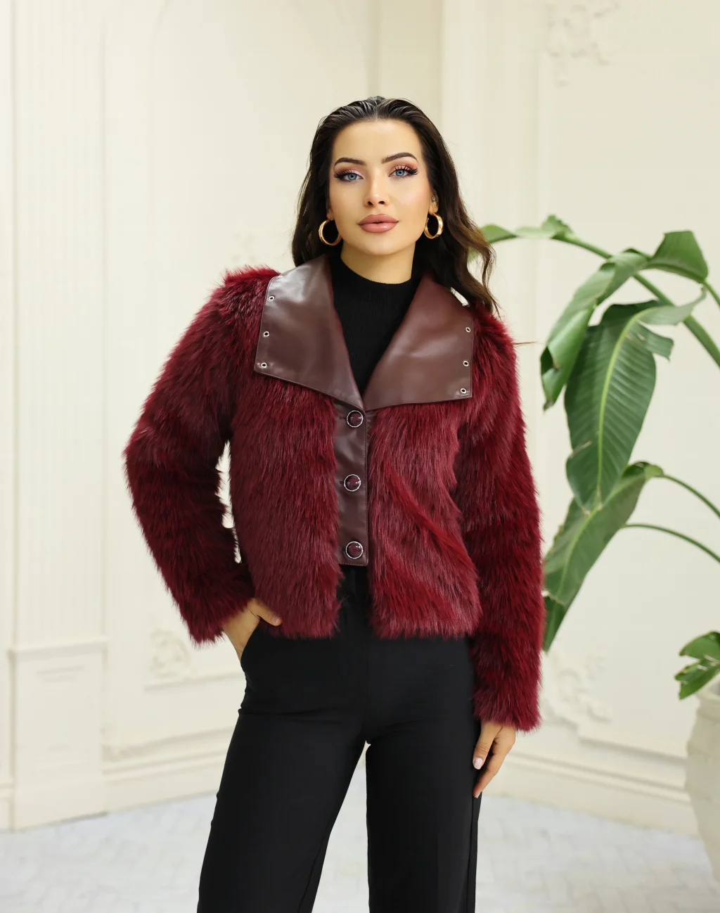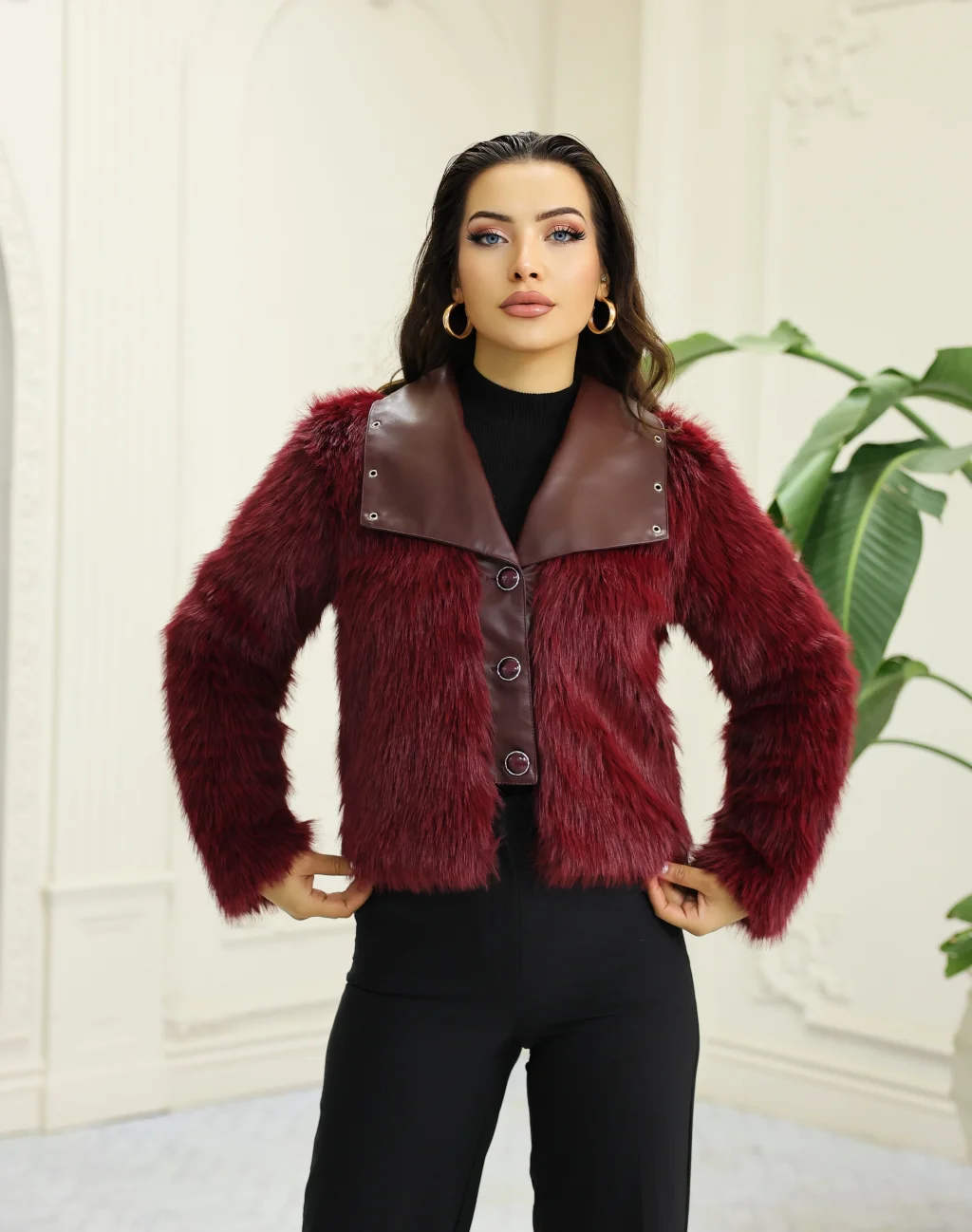 Kuşgözü Detaylı Geniş Yaka Deri&Kürk Bordo