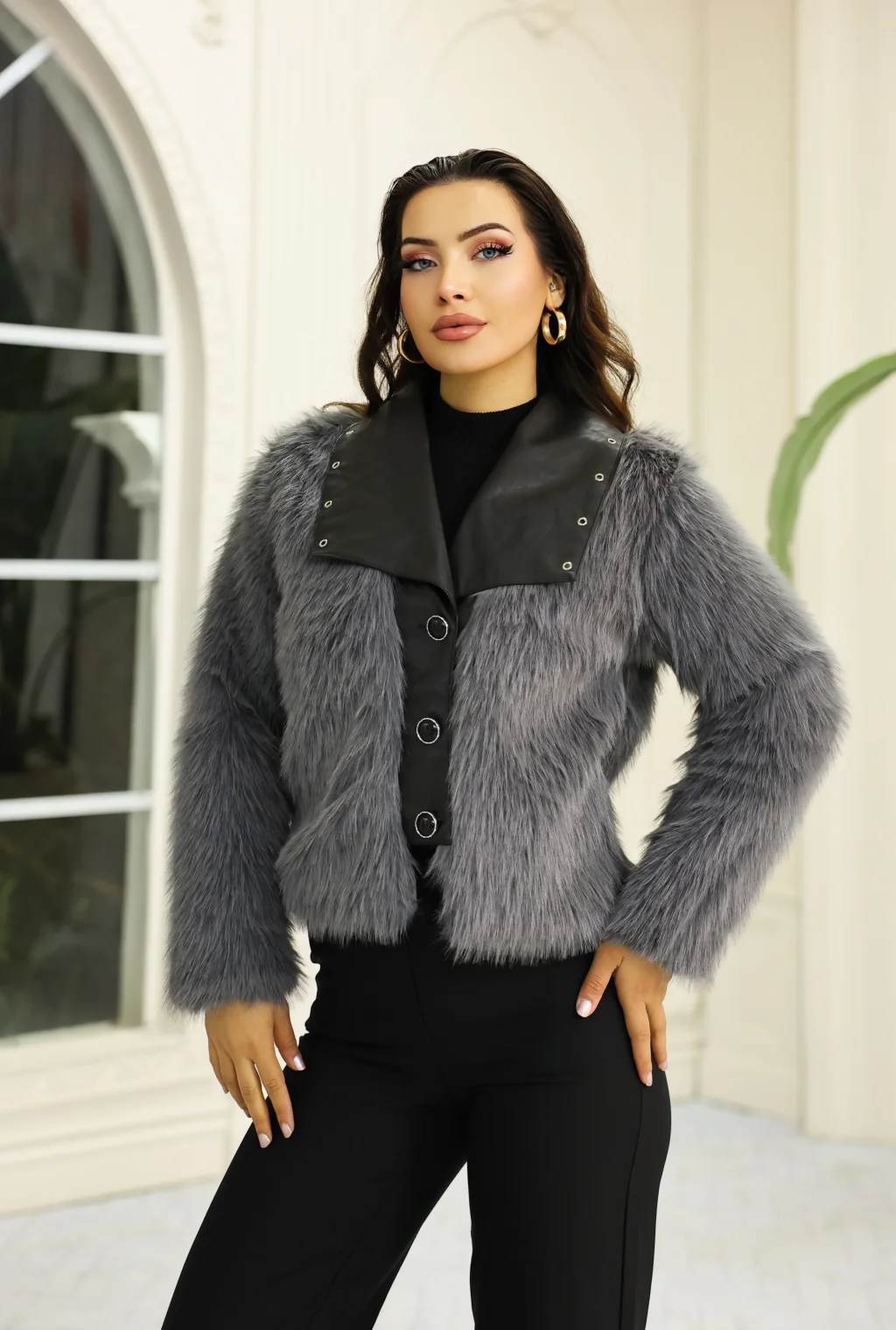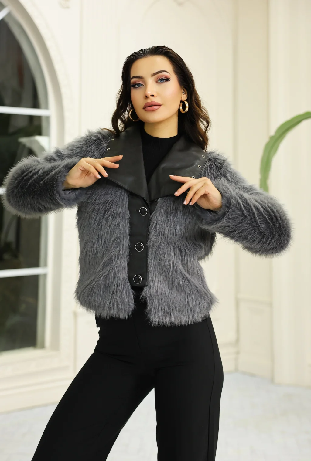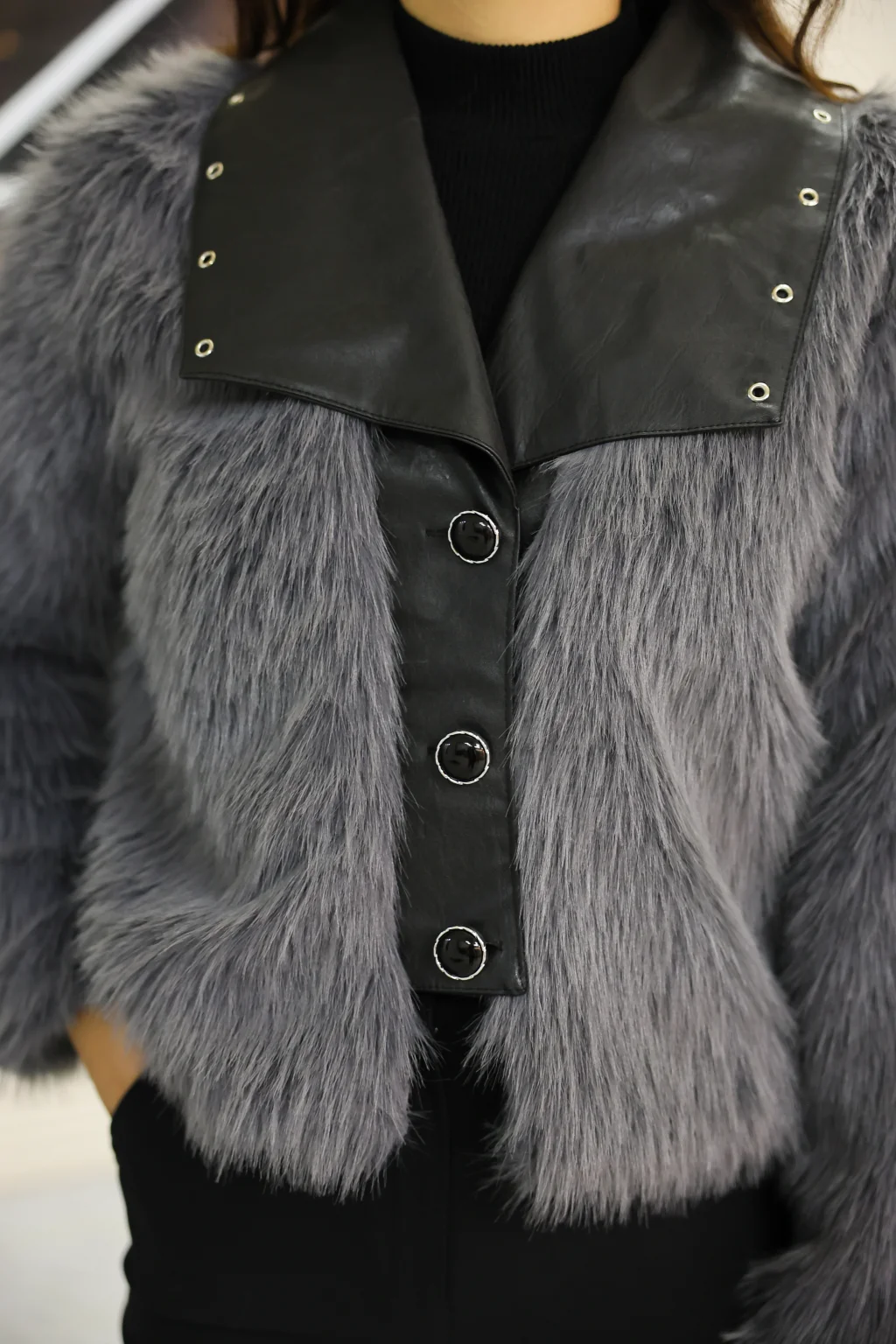 Kuşgözü Detaylı Geniş Yaka Deri&Kürk Gri