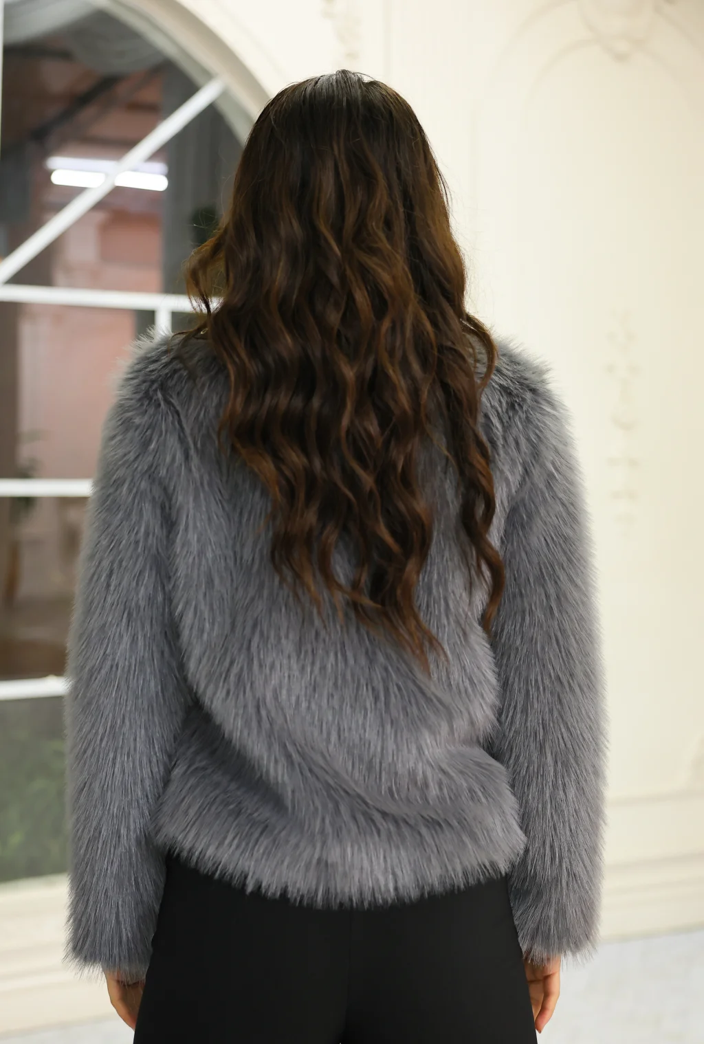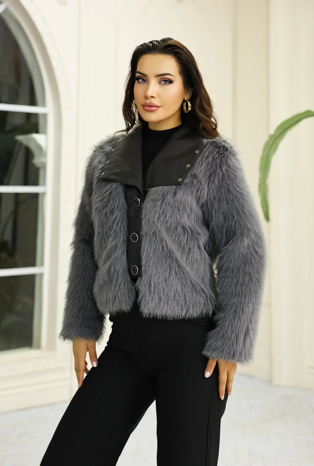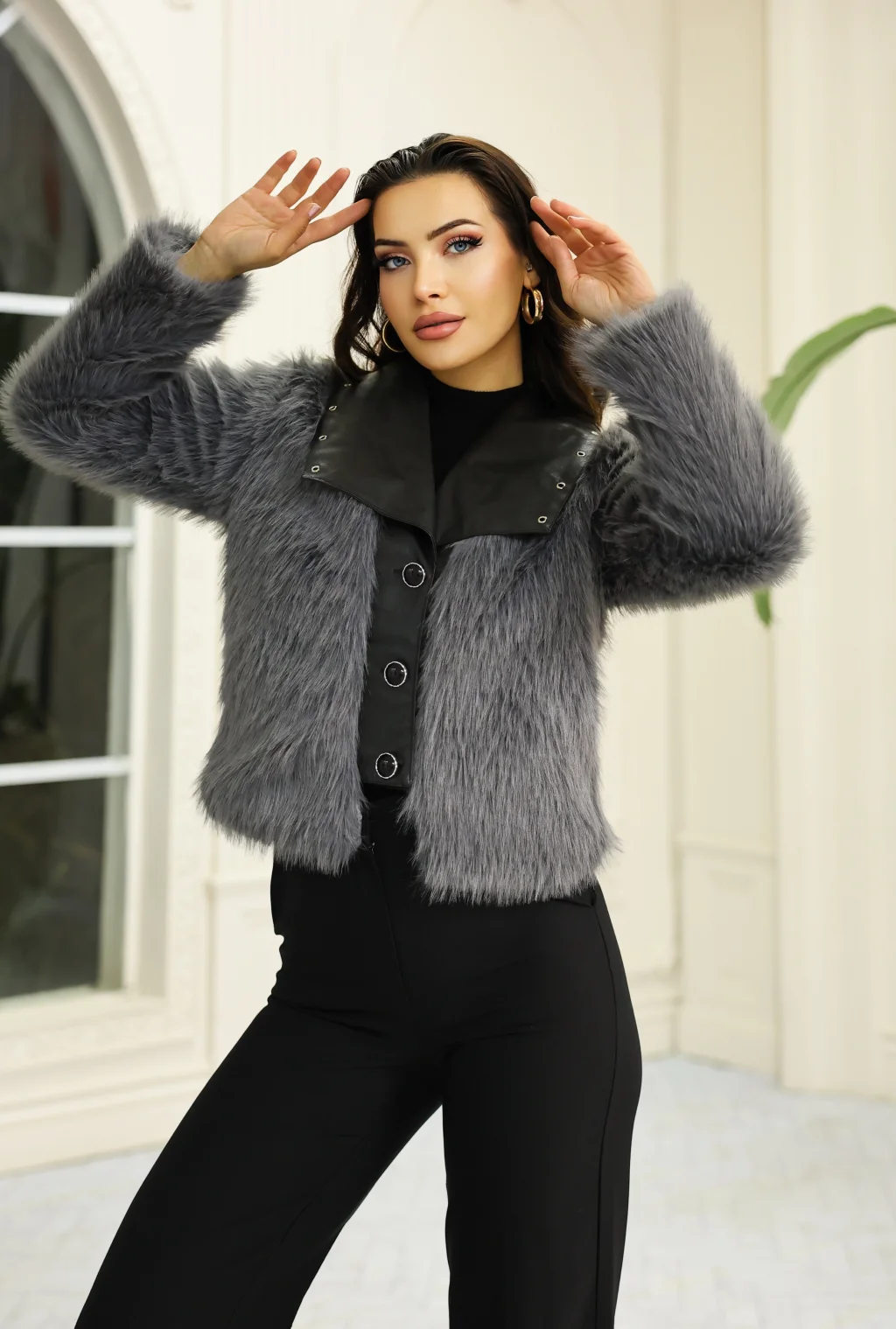 Kuşgözü Detaylı Geniş Yaka Deri&Kürk Gri